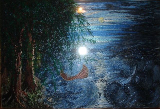 "Реве та стогне Днiпр широкий, Сердитий вiтер завива, Додолу верби гне високi, Горами хвилю пiдiйма. I блiдий мiсяц на ту пору Iз хмари де-де виглядав, Неначе човен в синiм морi, То виринав, то потопав..." |